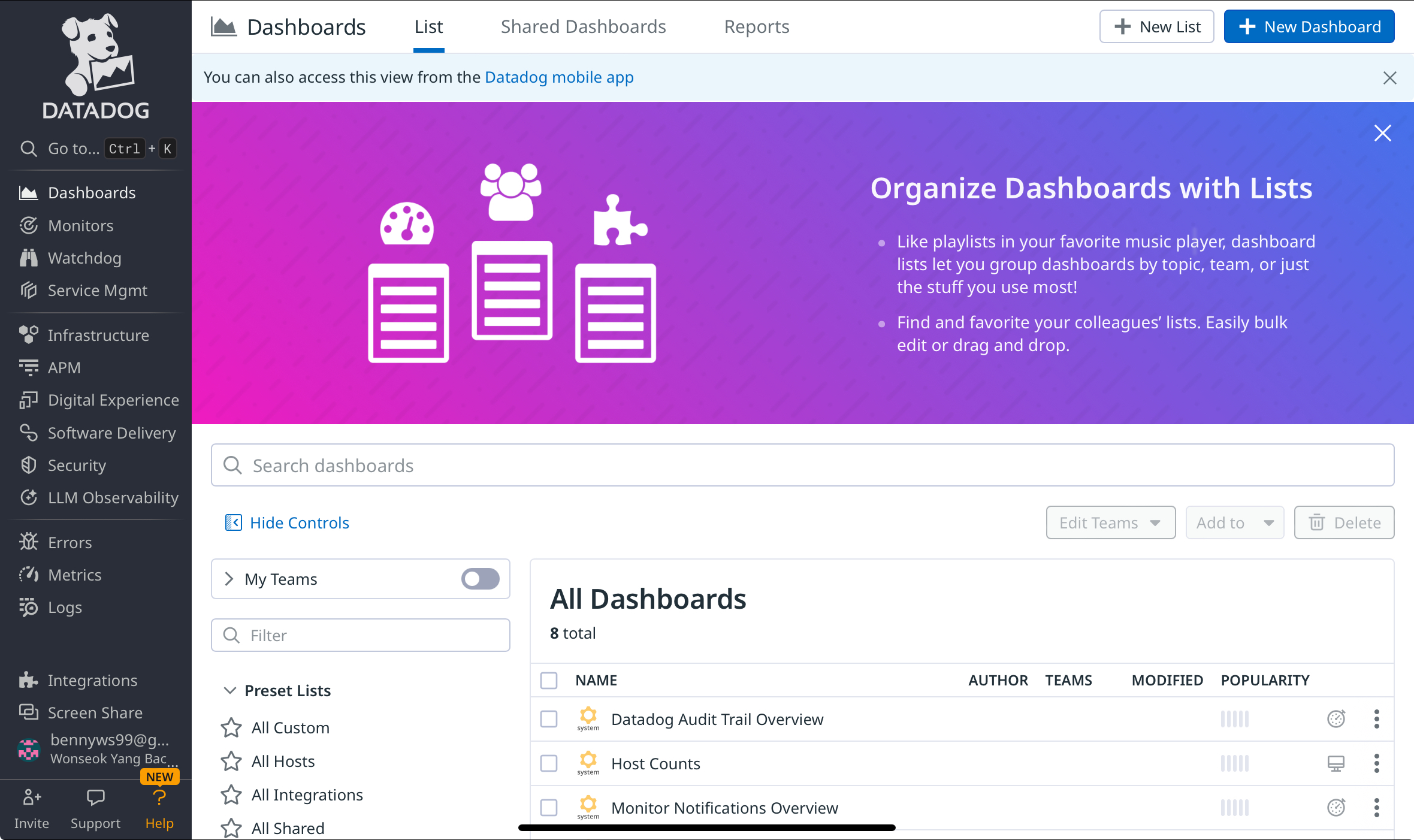 로그인 후 아래로 내리다 보면 귀여운 DataDog 로고가 보인다.